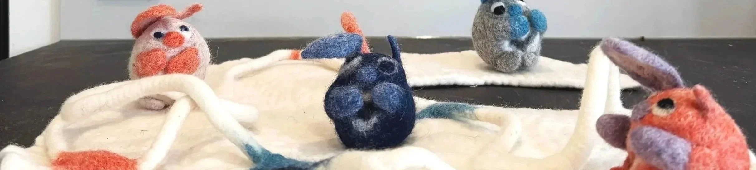 W-Wesen sind kleine gefilzte Skulpturen, die ich selbst entworfen habe – Avatare unserer menschlichen Ambivalenz. Etwa 5 cm groß, ei-förmig, mit asymmetrischen Ohren und Augen verkörpern sie das "Double You" in uns allen: verletzlich und stark, suchend und findend, getrennt und verbunden.